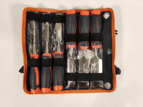 Nine as new Presch Wood Chisel Set with bag, 6, 12, 18, 24, 32 and 38mm (4260465137895).