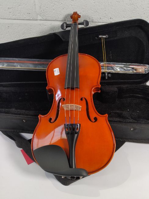 A pre-owned Gear4music student violin, full size in travel case with accessories.