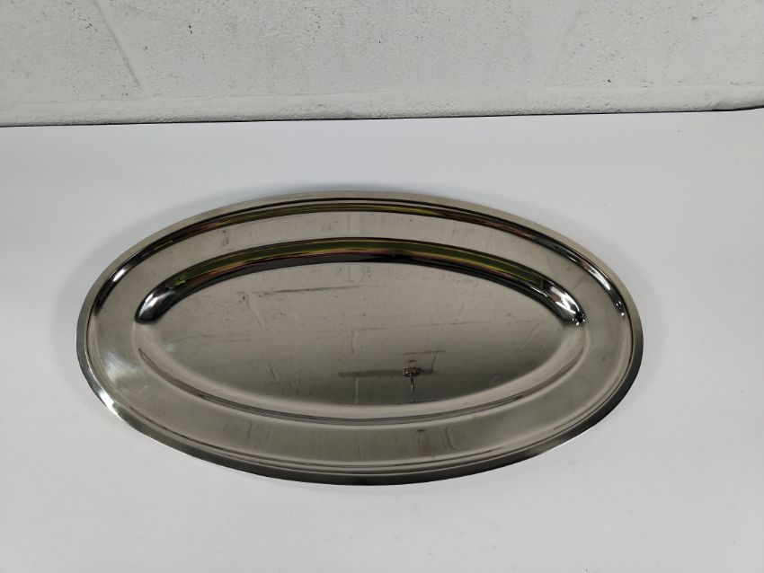 Thirty as new stainless steel oval dishes, fish, double rim, narrow - 560mm (may show signs of long term storage).