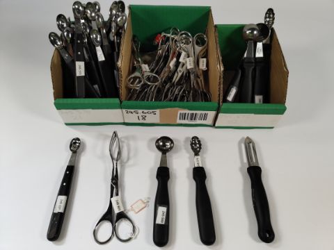 A quantity of Wusthof related items to include pastry tongs (5902), round melon ballers 30mm (4240) and oval plain melon ballers 18mm (4242) (tray not included).