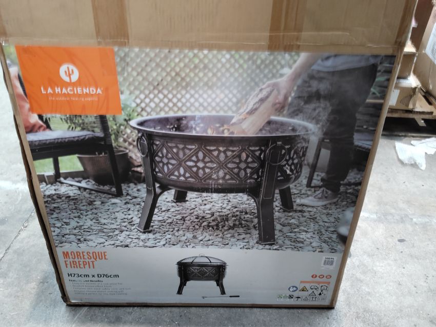 An as new La Hacienda Moresque Deep Steel Firepit with Grill, H73cm x D76cm (5055025580940) (stock image).