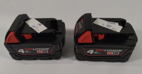 Two Milwaukee M8B4 M18 4.0AH power tool batteries.