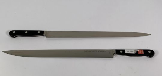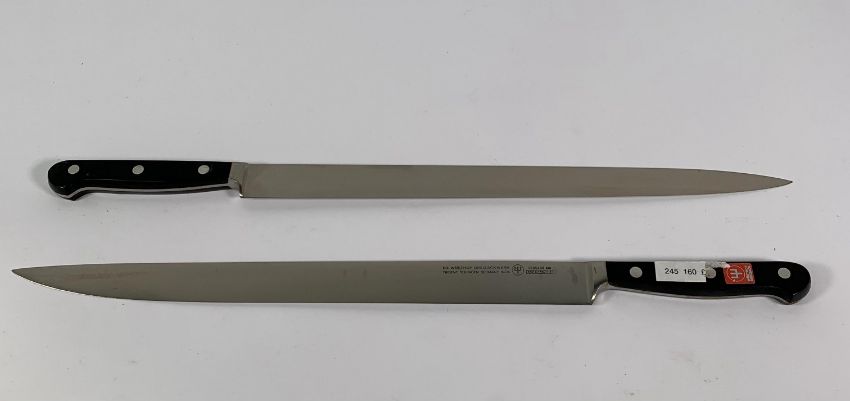 Two ED. Wusthof Dreizack Werk narrow slicer bolstered 320mm knives (4520) (over 18's only).