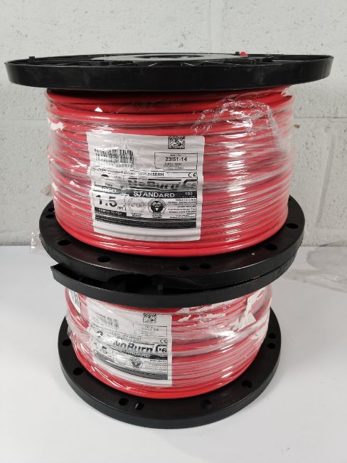 Two as new No Burn Platinum Fire Resistant Cable 1.5mm² 2+E Red (VFP-215ERH), 100m.