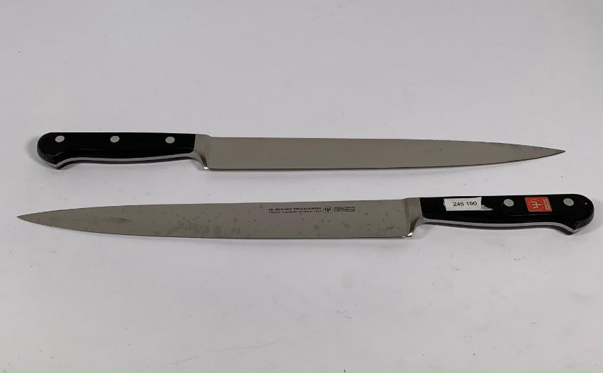 Two ED. Wusthof Dreizack Werk Tranchelard long slicer bolstered 260mm knives (4522) (over 18's only).