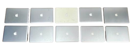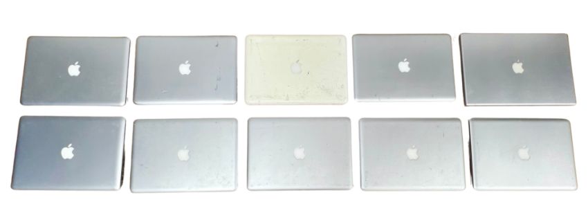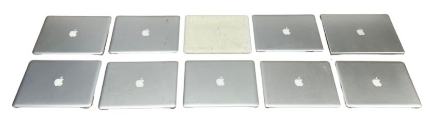 Assorted pre-owned Apple MacBooks: 7 × A1278, 1 × A1181, 1 × A1842, 1 × unknown model (Drives removed, sold as seen for parts only).