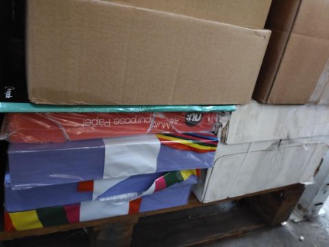 A pallet of assorted office stationery to include coloured paper, photo paper, labels, laminate pouches, envelopes and more.