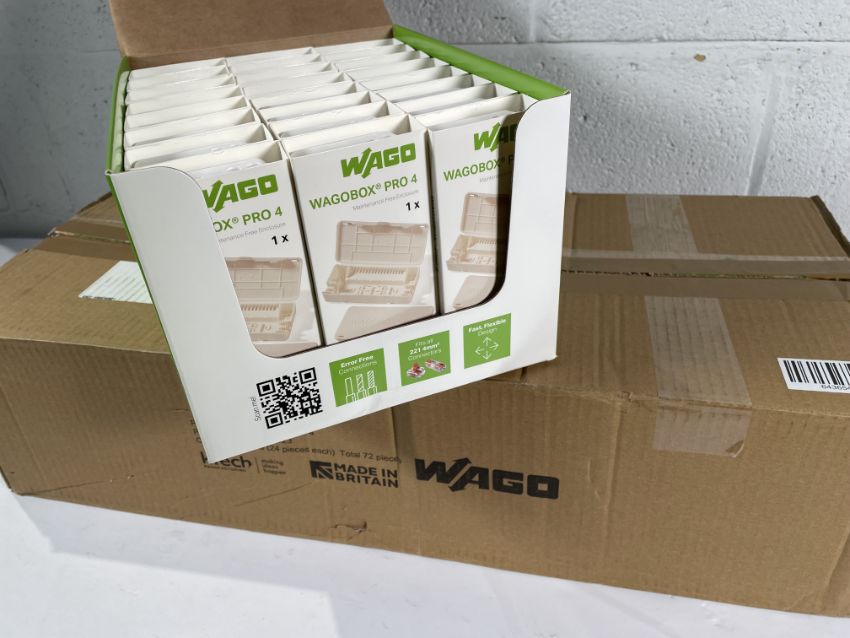 Three boxes of 24 as new Wagobox Pro 4 junction box enclosures.