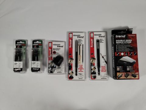 Six as new Trend products to include 2x Plain Pile Router Cutter, 2x Long Magnetic Bit Holder, 1x Double Sided Bench Stone, 1x Snappy Hex Keyless Chuck.