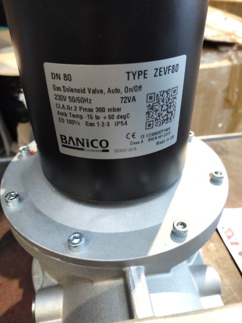 A Banico gas solenoid valve automatic-reset 80mm 230V, boxed (ZEVF80).