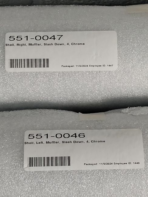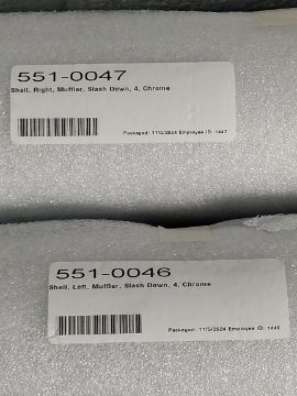 An as new pair of S&S slash-down 4" mufflers in chrome for Harley Davidson (REF: 1x left, 551-0046 and 1x right, 551-0047).