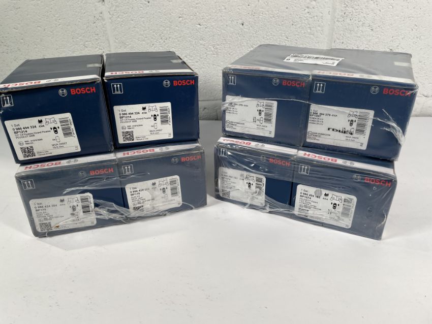 Eight sets of boxed as new Bosch brake pad sets: 0 986 494 - 379 BP1287/163 BP1074/364 BP175 and 324 BP1214 - 2 of each.