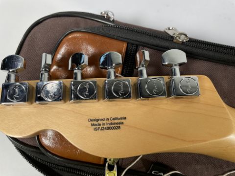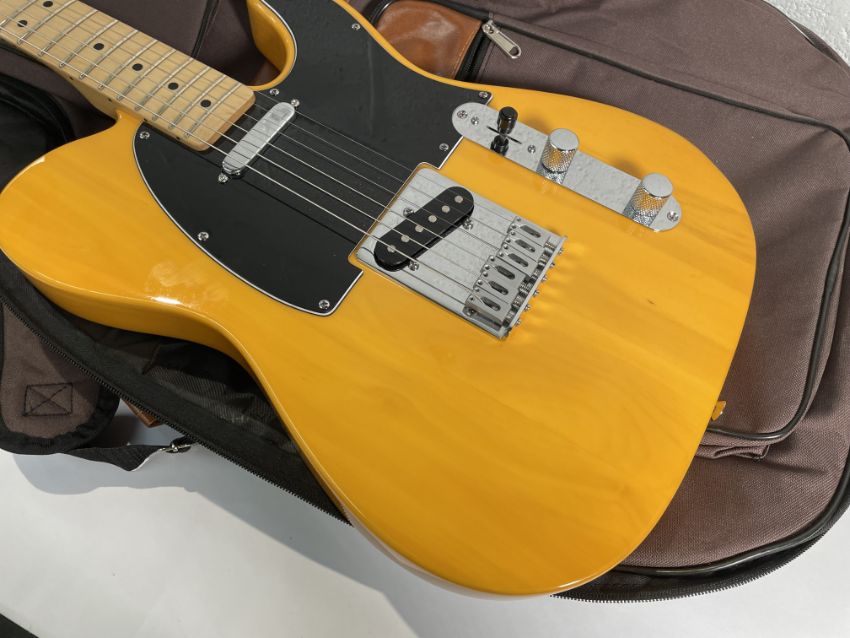 A pre-owned Fender Standard Telecaster, maple fingerboard, black pickguard, butterscotch blonde with gig bag.