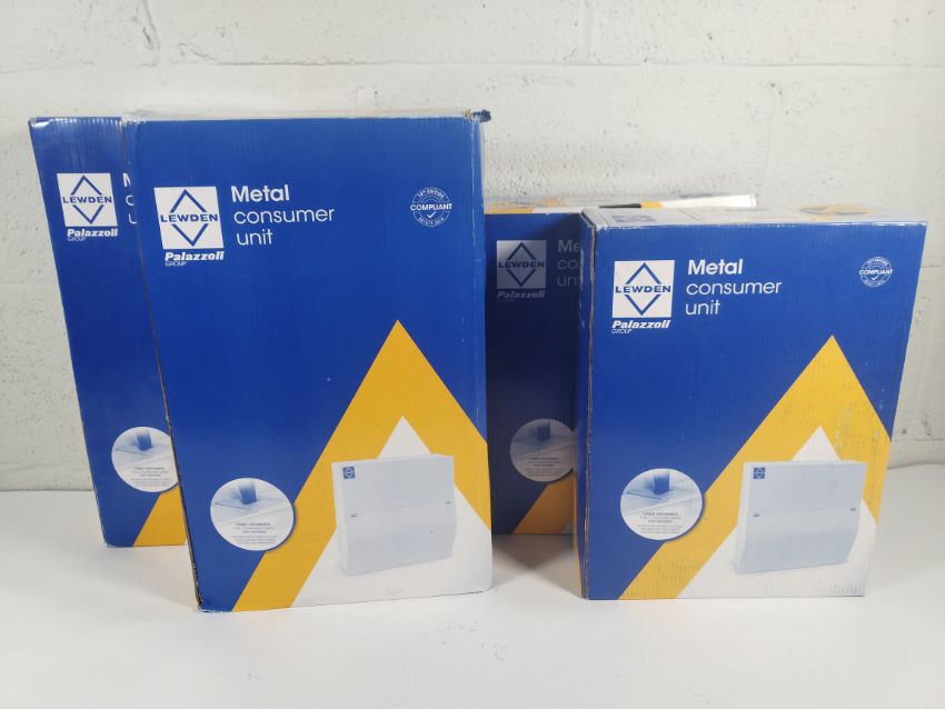 Four as new Lewden Products to include 2x 13 usable way consumer unit with main switch & type 2 surge, Size: 268 x 353 x 106 mm (REF: PRO-R16MS) and 2x 18 usable way RCBO consumer unit with main switch & type 2 surge, Size: 268 x 443 x 106 mm (REF: PRO-R21MS).