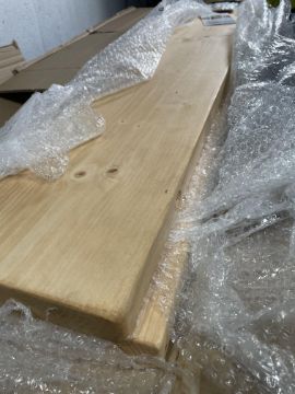 Two as new Chill House Tudor Oak solid wood flat floating shelves, 150 x 22 x 3.5cm (approximately) with fixings.