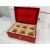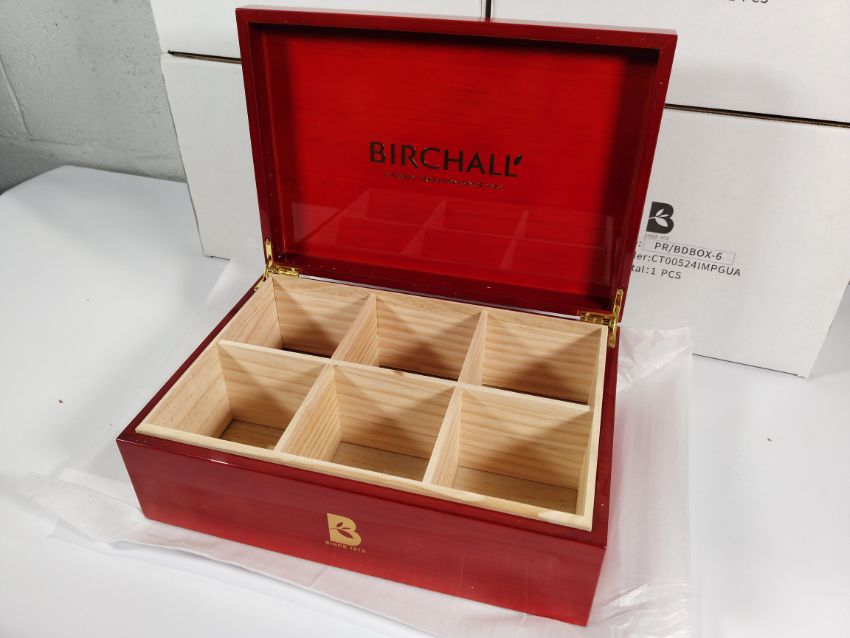 Four as new Birchall Tea six compartment box in red (for enveloped prism tea bags).