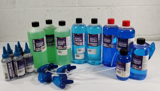 Fourteen bottles of assorted bicycle cleaners and lubricants.