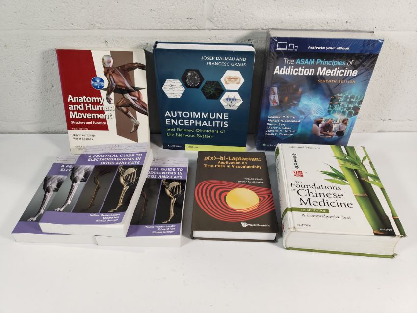 Eight pre-owned Medical and Scientific books to include: 1x The Foundations of Chinese Medicine Third Edition (hardcover), 3x A Practical Guide to Electodiagnosis in Dogs and Cats (softcover), 1x Anatomy and Human Movement - Structure and Function Sixth Edition (softcover), 1x Autoimmune Encephalitis and Related Disorders of the Nervous System, 1x P(x)-bi-Laplacian: Application on Time-PDEs in Viscoelasticity (hardcover), 1x The ASAM Principles of Addiction Medicine Sixth Edition (hardcover). All books are in good condition have varying amounts of cosmetic damage to the their hardcovers or corners.