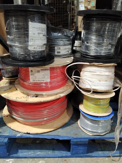 A pallet of assorted electrical reels and related items.
