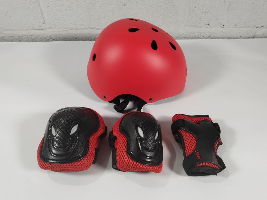 A large amount of XJD Kids Helmets with elbow/knee pads and wrist guards, various sizes and colours.