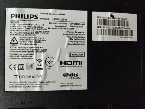 A pre-owned Philips 55" 4K Ultra HD Ambilight HDR Smart TV (REF: 55PUS6262/05, Sold as seen).