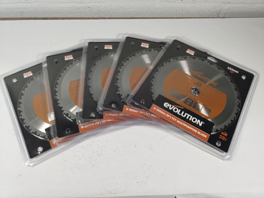 Five as new Evolution Tools multi-material cutting chop saw blade 255mm.