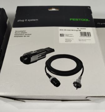 Three Festool related items - ACA 220-240/18V Ergo GB (202503), FS guide rail (485724) and one box (50x) granet P60 sander pads (575161).