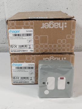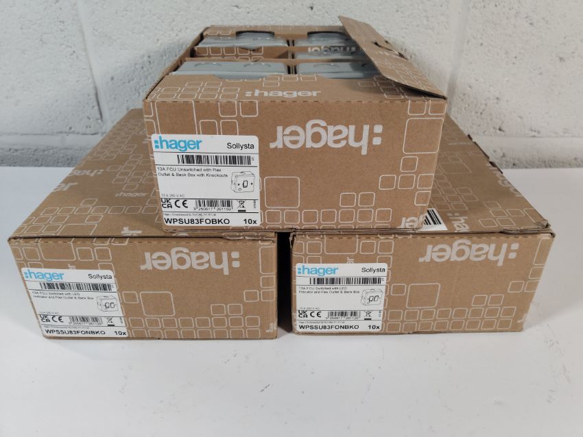 Twenty nine as new Hager Products to include 20x Hager Sollysta 13A FCU switched with LED indicator and flex outlet & black box (EAN: 3250617261128) and 9x Hager Sollysta 13A FCU unswitched with flex outlet & black box with knockouts (EAN: 3250617261159).
