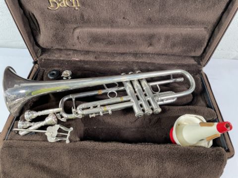 A pre-owned Bach Stradivarius Model 37 Trumpet with a Humes & Berg Cup Mute.