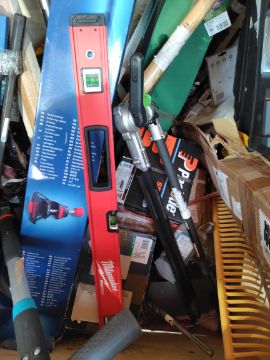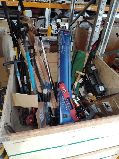 Assorted as new and pre-owned tools, hardware and related (wooden crate not included)