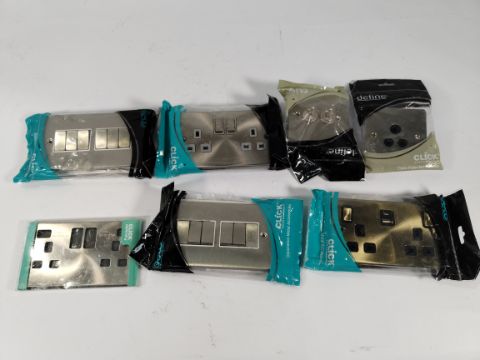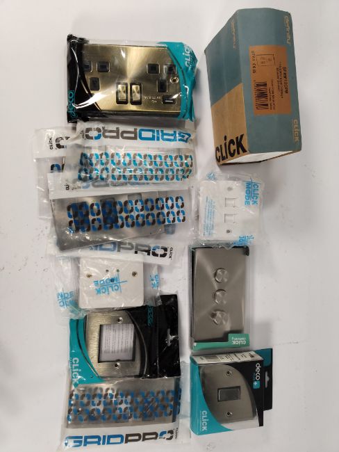 A large quantity of Click Plug covers, light switches and related to include brushed stainless steel click definity 4g dimmer/speed SW plate, Click definity 115v/230v dual voltage shave socket and other related items (approximately 125 items).