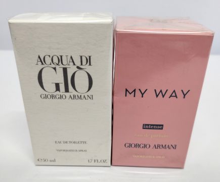 Two as new Giorgio Armani fragrances - Acqua Di Gio eau de toilette 50ml and My Way eau de parfum intense 50ml, sealed boxes.