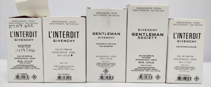 Five nearly new Givenchy perfumes/testers and related, boxed (please note: bottles may have been very slightly used/packaging may have damage).