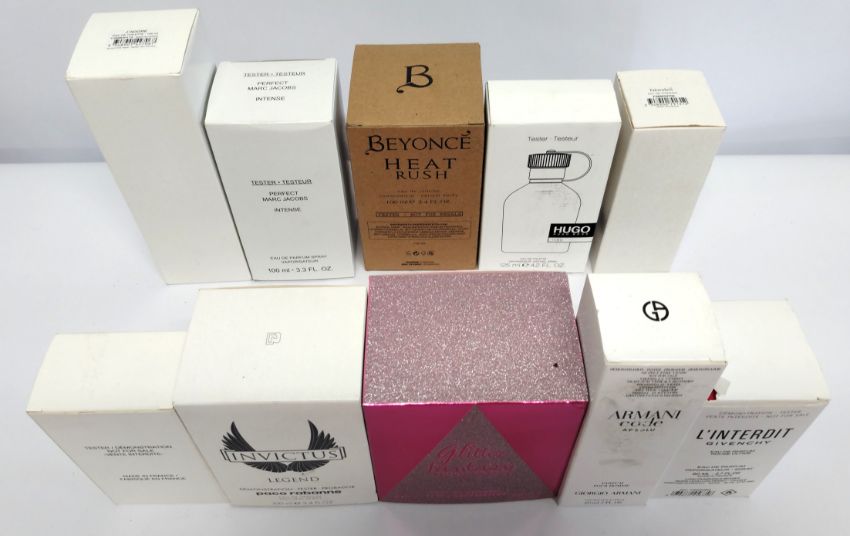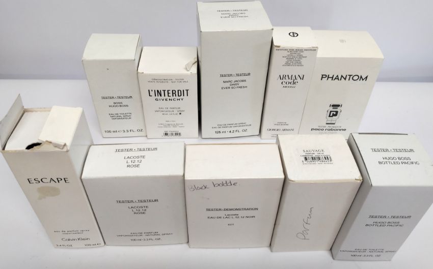 Thirty nearly new perfumes/testers and related to include Beyonce, Marc Jacobs, CK, Lacoste, Hugo Boss and more, boxed (please note: bottles may have been very slightly used/packaging may have damage).