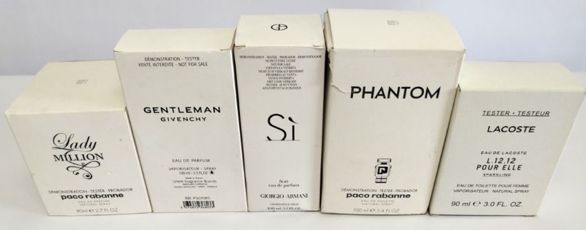 Five nearly new perfumes/testers and related- Givenchy, Giorgio Armani, Paco Rabanne and Lacoste, boxed (please note: bottles may have been very slightly used).