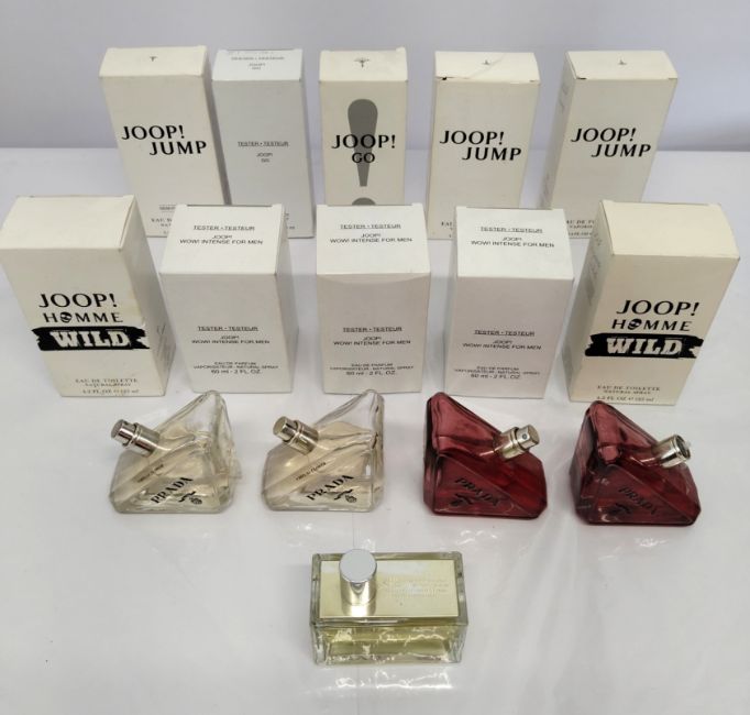 Thirty Prada and Joop perfumes/testers and related (please note: bottles may have been used/packaging may have damage/missing spray tops or lids).