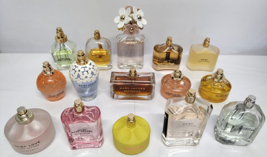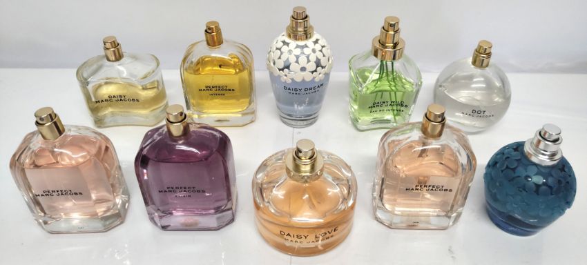 Forty Marc Jacobs perfumes/testers and related (please note: bottles may have been used/packaging may have damage/missing spray tops or lids).