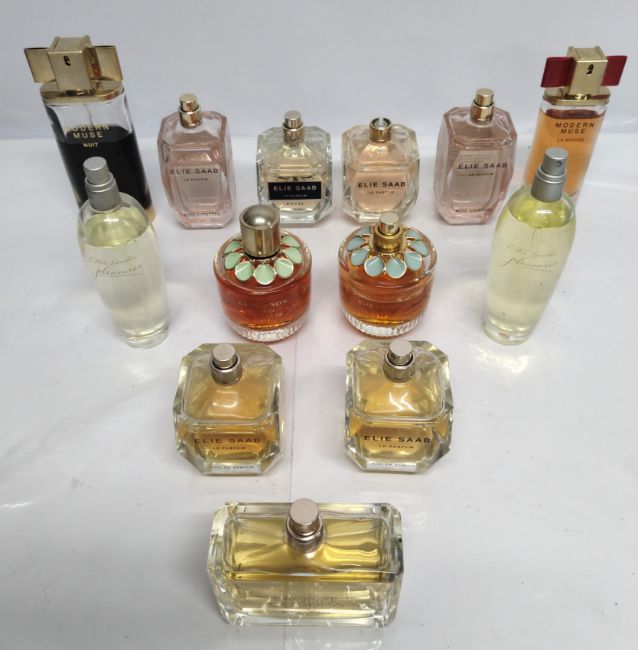 Thirty one Elie Saab and Estee Lauder perfumes/testers and related (please note: bottles may have been used/packaging may have damage/missing spray tops or lids).