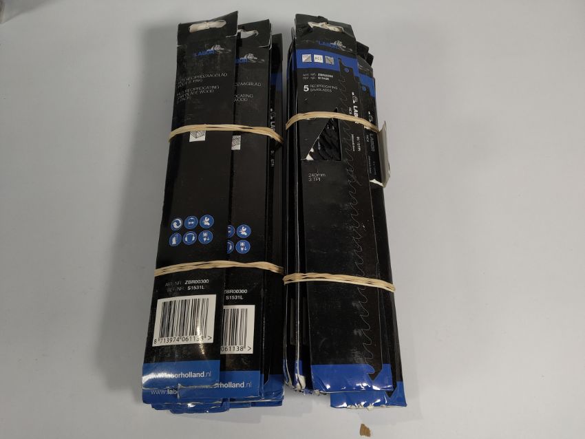 One crate of as new Labor drill bits in various sizes and approx. 20 packs x 5 ZBR00200 reciprocating saw blades.