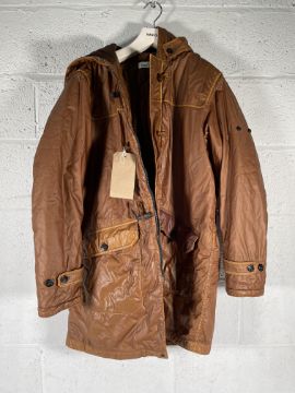 A pre-owned Stone Island Mussola Gommata Compass Patch Long Line Jacket, XXL (arm patch missing).