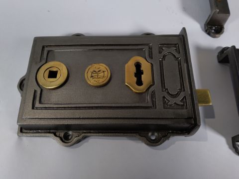 Two pre-owned cast iron and brass Davenport Rim locks and two keys.