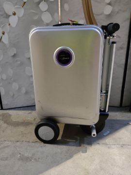 A pre-owned Air Express G45 wheeled ride on suitcase with battery.