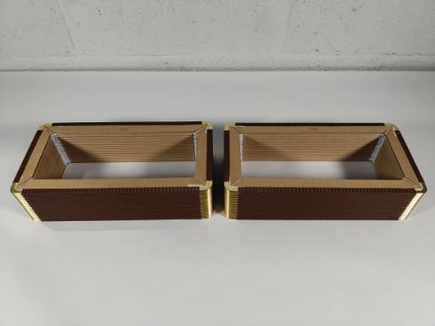 Two Harmonikas Bellows x 20 folds, light leather corner, inside P3 NAT paper, outside K10 brown striped, R12 gold for an Aerophone instrument, 145 x 286 x 25mm.