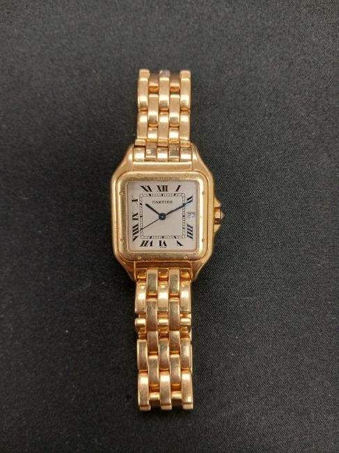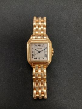 An 18ct gold Cartier wristwatch with square gold case, fitted with an 18ct gold Cartier link bracelet and clasp. Quartz movement. Gross weight approximately 114 grams. Showing light surface wear consistent with age and use. Movement not tested. Viewing by prior appointment only.