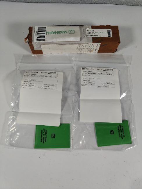 An as new Magnaflux Yoke test weight (10lbs) and two as new Magnaflux magnetic flux indicator strips (1x Type A and 1x Type G).