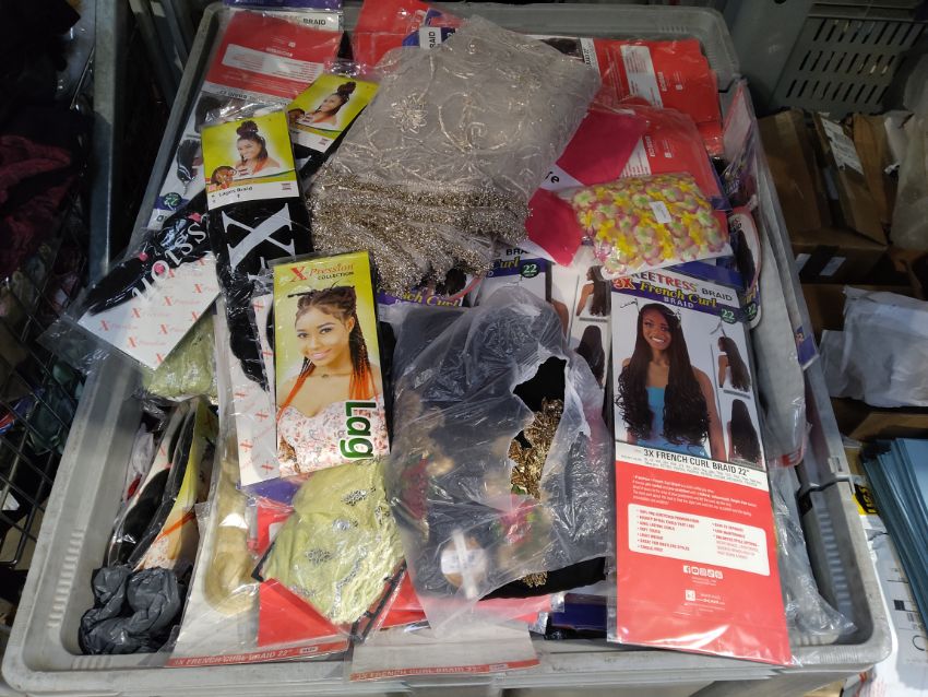 Large collection of imitation wigs and braids and assorted Asian style clothes. (Stillage not included).