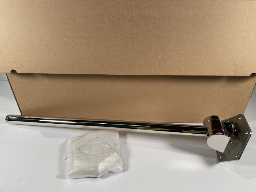 As new Fitzroy of London bathroom fixings: The Constable 800mm, stainless steel, concealed fixing, single arm hinged support rails, polished nickel plated (x2), The Gosfield 800mm concealed fixing removable single arm hinged support rail, polished (x1), The Gosfield, stainless steel flangeless fixing grab rails, 610mm, polished nickel plated (x3), removable hinged rail backing plate kits (x2) and removable Doc M shower seat blanking plate kits (x2), both polished nickel plated.