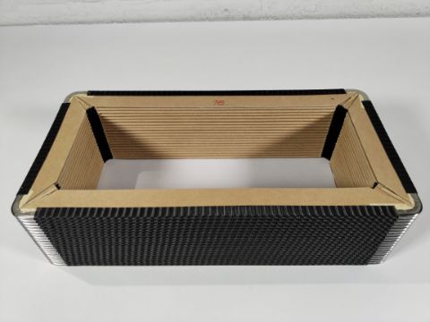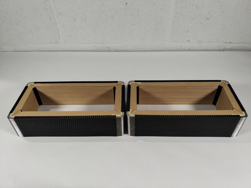 Two Harmonikas Bellows x 20 folds, black leather corner, inside P11 red cloth, outside K14 black striped, R12 for an Aerophone instrument, 145 x 286 x 25mm.