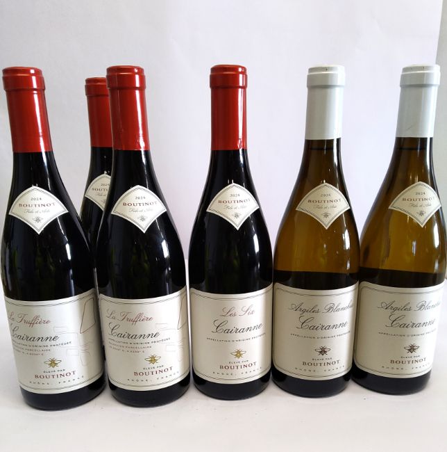 Three La Truffiere Cairanne 2024 Boutinot red wine 3 x 750ml, one Les Six Cairanne 2024 Boutinot red wine 750ml and two Aigiles Blanches 2024 Boutinot white wine 2 x 750ml.