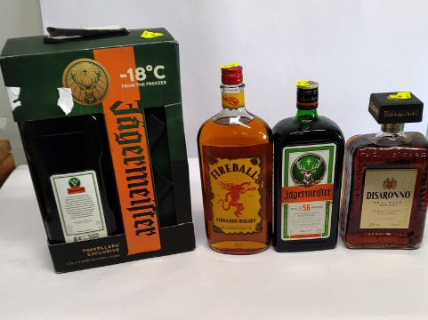 Four assorted spirits to include two Jagermeister 1 x 1,750ml, 1 x 1L, Fireball Cinnamon whisky 1L, Disaronno Original 1L.